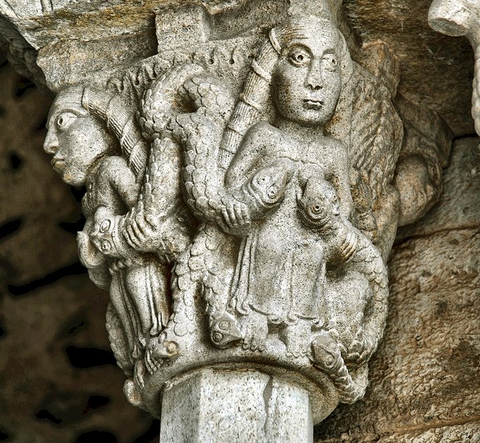 Girona, the cloisters. The flames of Hell are licking the groin of the figure on the left.